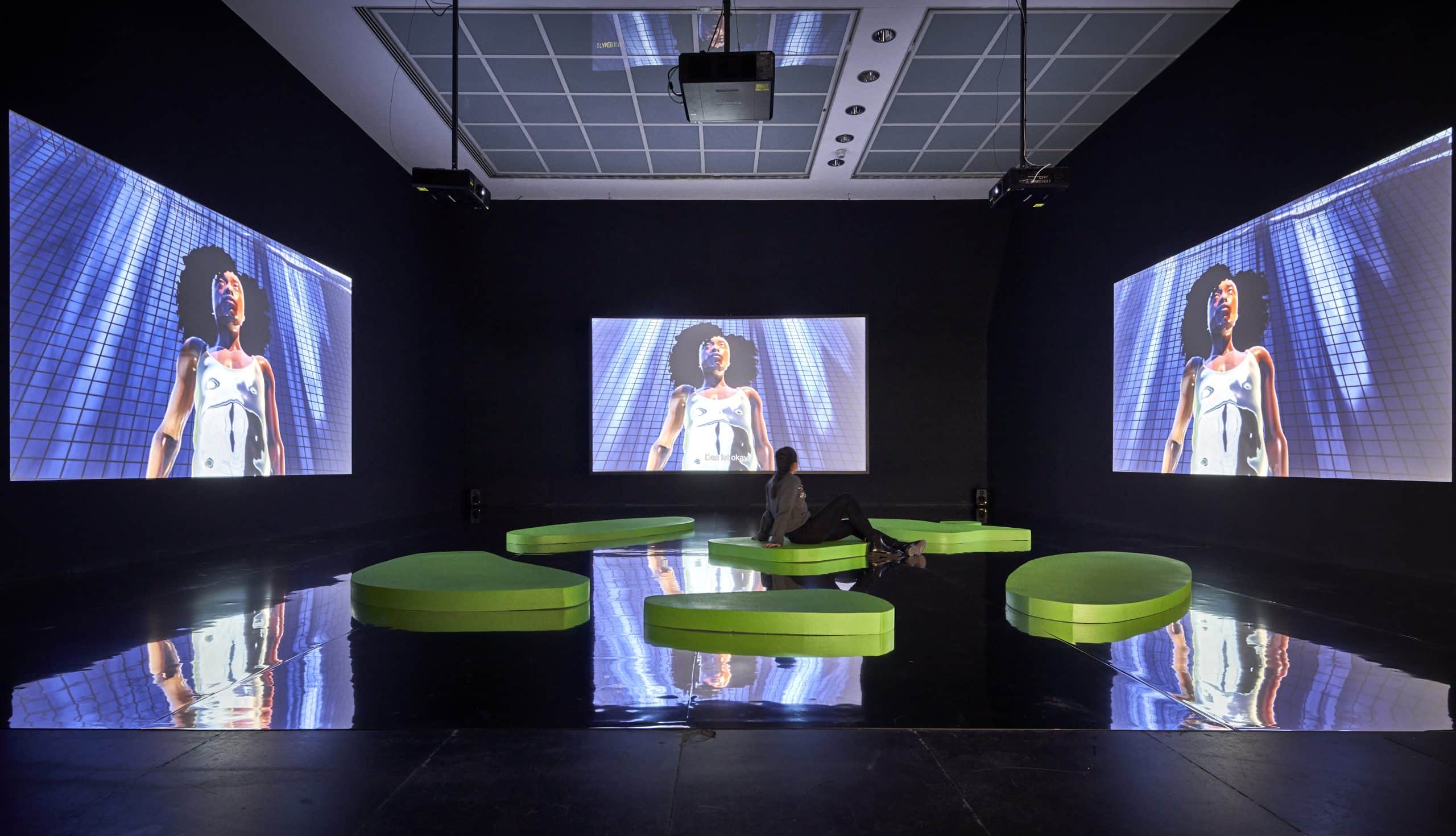 The modern art gallery Frankfurter Kunstverein in Germany is currently analysing the human desire for digital escapism and our urge to expand our abilities through the use of technology. The exhibition “How to Make a Paradise – Seduction and Dependence in Generated Worlds“ is composed of multimedia installations, digital films as well as virtual reality experiences. "Feel My Metaverse" installation on Harlequin Hi-Shine All projects are presented with the use of high end technology and the quality of materials for the interior design was taken equally seriously. This is why the space installation “Feel My Metaverse” required the installation of 85m² of silver Harlequin Hi-Shine vinyl. "Feel My Metaverse" installation on Harlequin Hi-Shine “Feel My Metaverse” is a three channel work which is partly accessible but also takes place virtually. It was created by the artist collective Keiken + George Jasper Stone, who had used Harlequin Hi-Shine’s mirror effect in previous projects and appreciated the quality of this vinyl floor. "Feel My Metaverse" installation on Harlequin Hi-Shine Franziska Nori, director of the Frankfurter Kunstverein, agreed: “A museum exhibition room is all about lasting perfection. Harlequin Hi-Shine fulfils these requirements perfectly. The durability of this high quality vinyl floor paired with its dramatic mirror effect are extraordinary.” "Feel My Metaverse" installation on Harlequin Hi-Shine Photos: Impressions of the current exhibition at the Frankfurter Kunstverein. Photographer: Norbert Miguletz, Copyright: Frankfurter Kunstverein